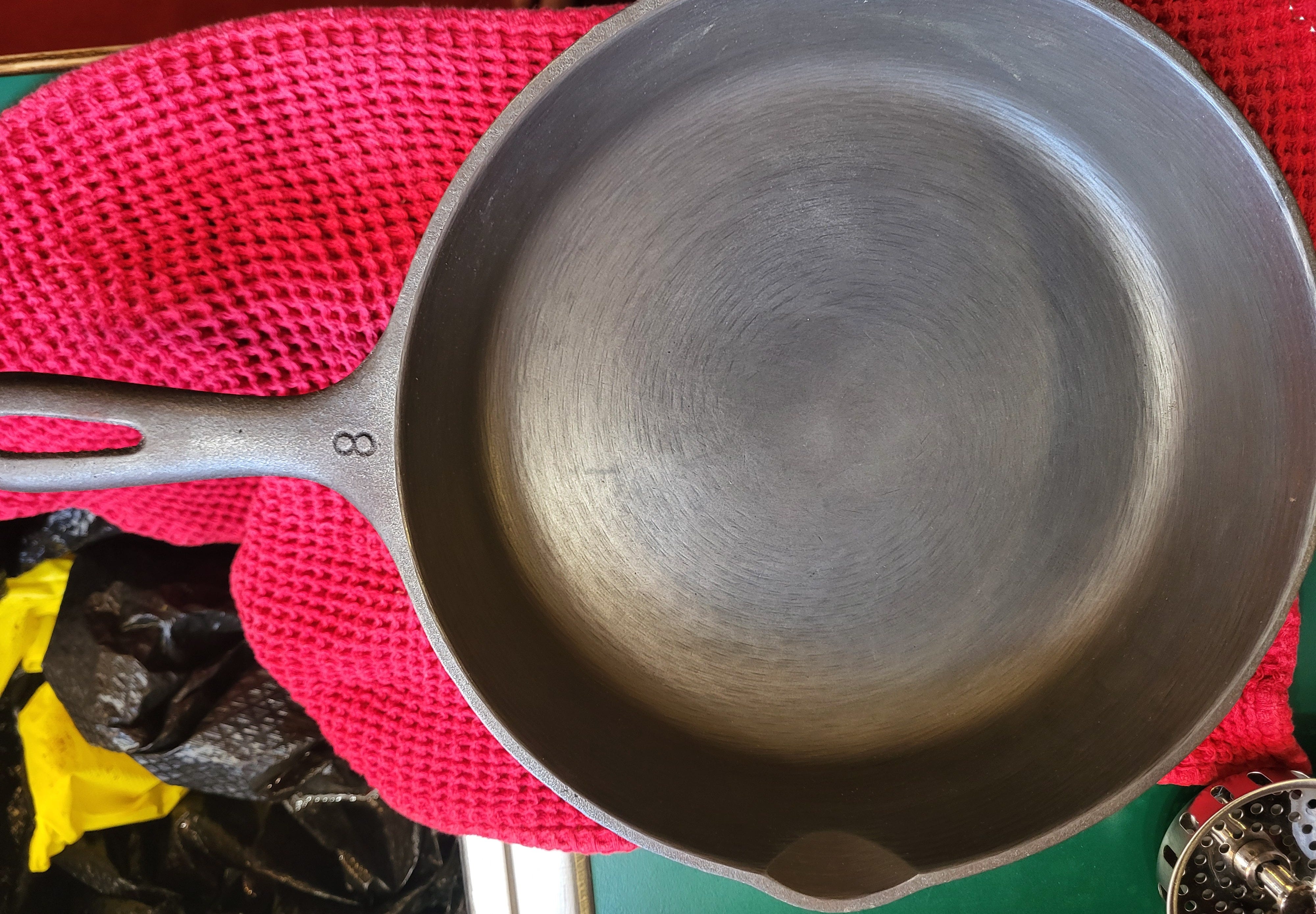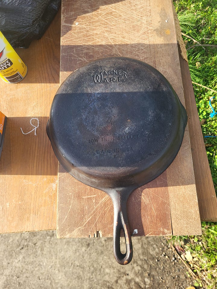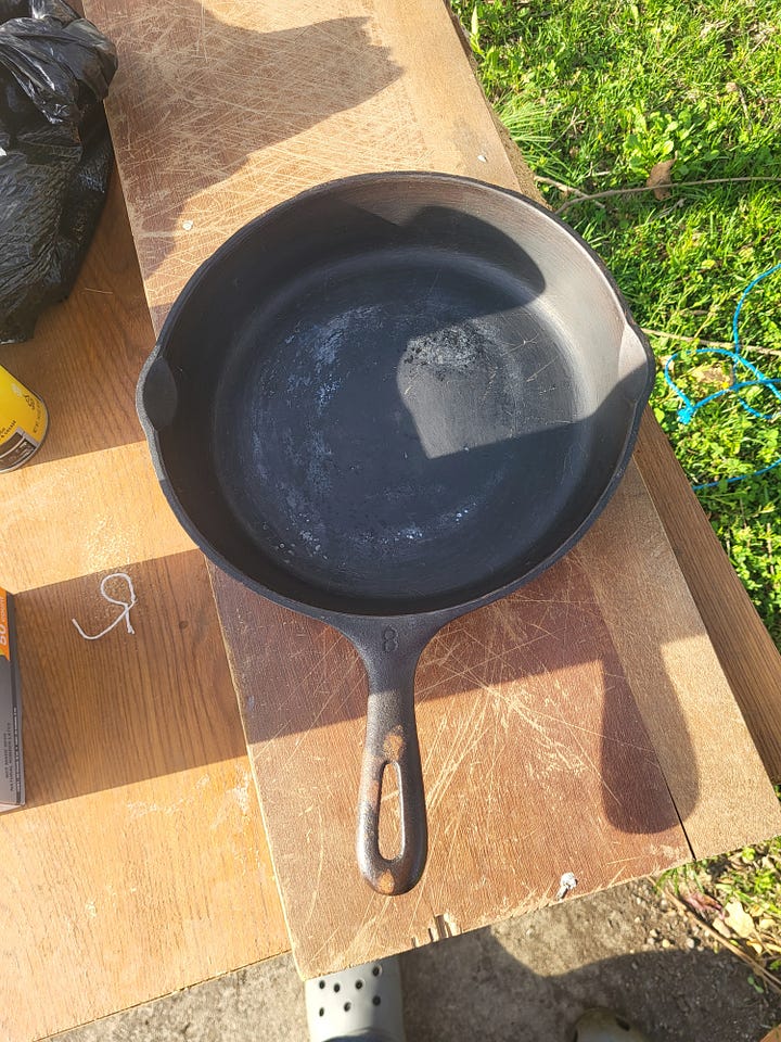 It wasn't in bad shape. No warping, no cracks. Just decades of carbon and old seasoning built up in uneven layers. Just rough and dark and a little neglected looking.