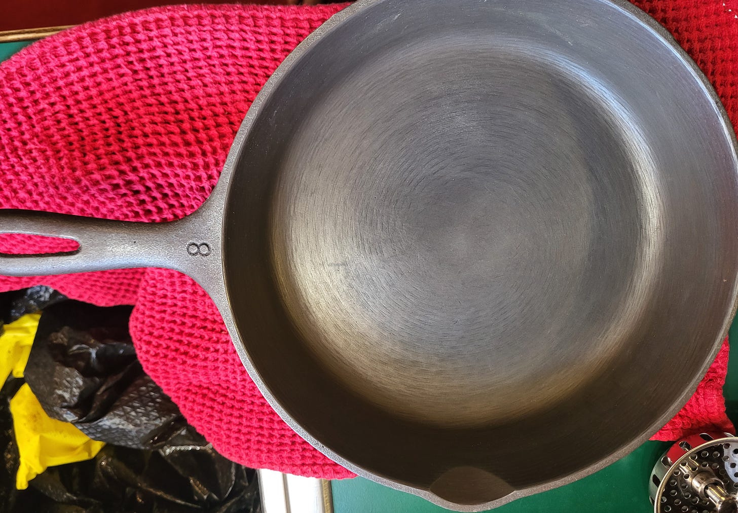 Specifically the circular tooling marks from the craftsperson who pulled that skillet out of its sandy mold, hooked it to a lathe, and expertly machined it to a smooth finish. That’s something you don’t see in modern skillets. That’s a direct connection from that person’s labor, though the stovetops, ovens, and campfires of the last 60 years, and into my care where I can pass it along someday.